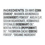 ingredients : zea mays;corn starch;maranta arundinacea;arrowroot;powder;kaolin clay;sodium bicarbonate;rosemarinus officinalis;rosemary;oil;mentha piperita;peppermint;theobroma cacao;cocoa