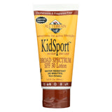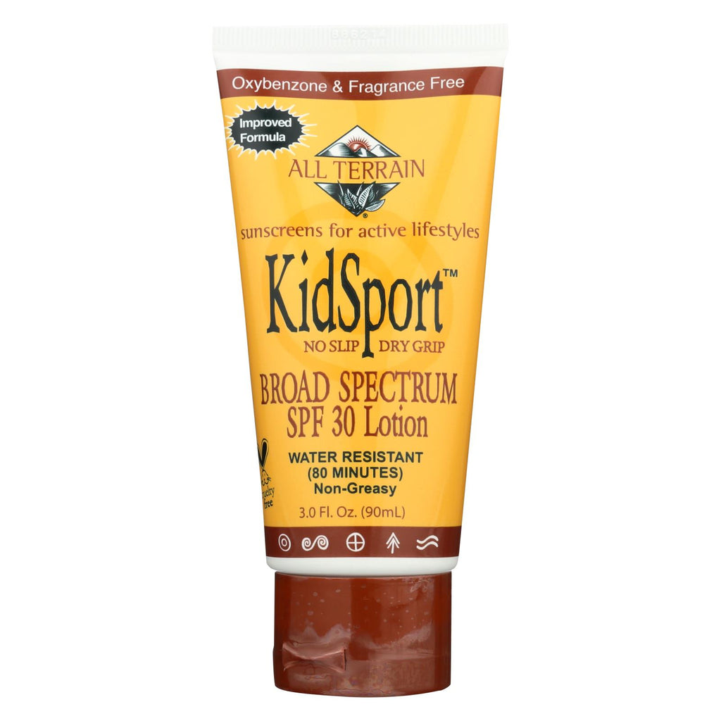 All terrain kidsport broad spectrum spf 30 lotion keeps your child's skin safe while they enjoy the outdoors. Our lotion is non-greasy for a dry grip and more comfortable feel. Swimming and sweating are no match for this lotion with a water-resistant formula, keeping your child free from the sun's rays for up to 80 minutes. This bottle contains 3 fl. Oz. Of broad spectrum spf 30 lotion.
