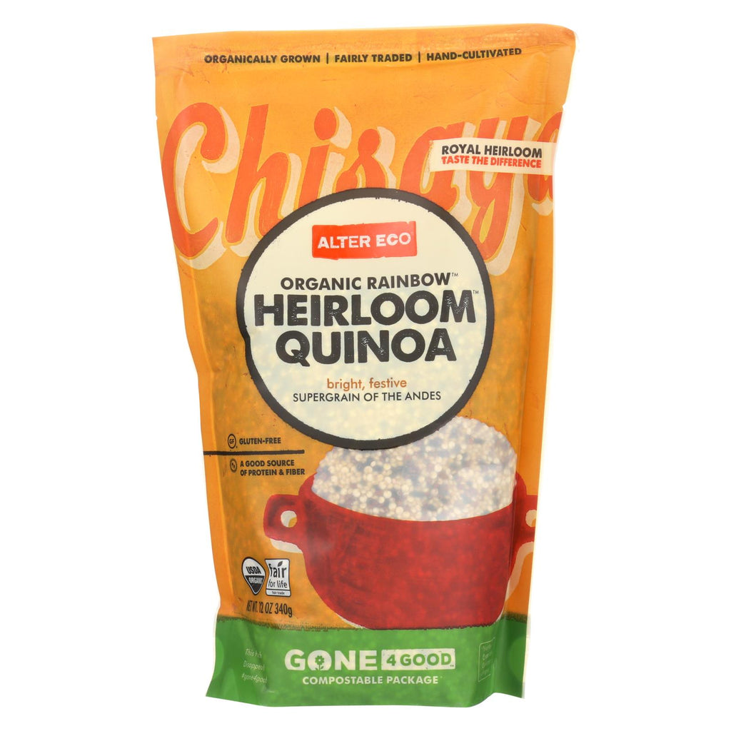 Alter eco's organic rainbow heirloom quinoa is a nutritious rainbow on your plate with a festive crunch. Each 12 oz. Package has 190 calories per serving. Our quinoa is free of gmos and loaded with whole grain goodness. It's harvested organically using environmentally friendly methods and is kosher with certified fair trade ingredients. Just one spoonful, and you’ll see why it should be the only quinoa that graces your plate. Nourishing foodie, farmer and field through sustainable foods from around the world.