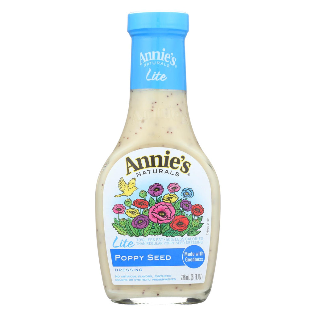 Annie's naturals lite poppy seed dressing is a favorite for its zingy, sharp flavor that takes any salad from dull to delicious. One of our most popular dressings, this light recipe gives you all the savory goodness you expect with the knowledge that you’re eating healthy at the same time. It’s made with distilled white vinegar, honey, poppy seeds and mustard for a full-bodied taste and only 4g of fat and 70 calories. We are proud to source only non-gmo ingredients with no artificial colors, flavors or preservatives. Plus, this dressing is gluten-free and vegetarian. Includes one 8 oz. Bottle of annie's naturals lite poppy seed dressing. See nutrition facts panel for allergens. Annie’s has a commitment to bettering the world through nourishing foods, honest words and conduct that is considerate and kind. From the farms we source our ingredients from all the way to the packaging our food is shipped in, we are conscious not only of your family’s health and wellness, but that of the planet.