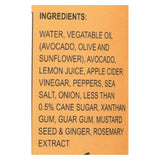 ingredients : water;vegatable oil;avocado;olive and sunflower;lemon juice;apple cider vinegar;peppers;sea salt;onion;less than 0.5% cane sugar;xanthan gum;guar gum;mustard seed & ginger;rosemary extract