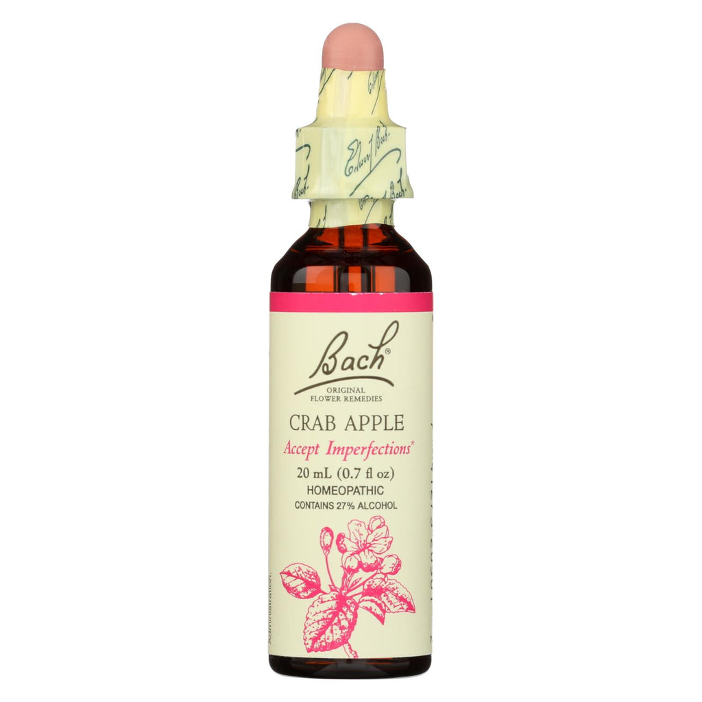 Bach crab apple accept imperfections homeopathic remedy may help provide natural relief of nervous tension. This 20 ml. Bottle contains a five-times dilution of crab apple mixed with 27% alcohol. To use, mix two drops in water and sip intermediately or place two drops directly in your mouth and repeat as needed.
