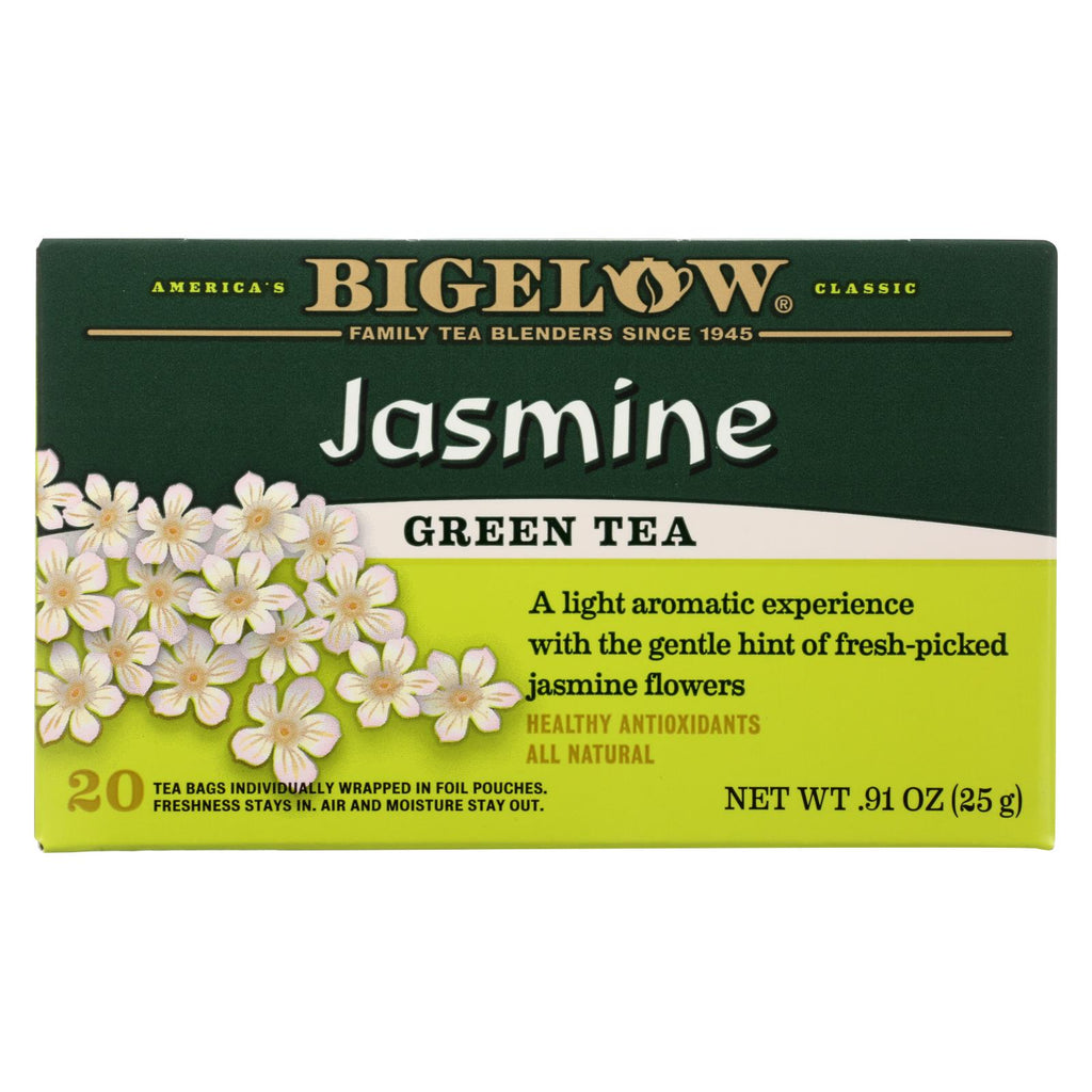 Bigelow tea green tea, jasmine enlivens the earthy flavors of this delicate tea. This product is a light aromatic experience with the gentle hint of fresh-picked jasmine flowers and provides healthy antioxidants to the drinker. According to the caff-o-meter, bigelow tea green tea, jasmine, contains 25-50 mg. Of caffeine per serving. What makes this product so special is that bigelow tea uses only hand-picked tea from the highest elevation gardens before gently processing it to bring out the natural flavor of their teas. Every box of bigelow tea green tea, jasmine, contains 20 tea bags.