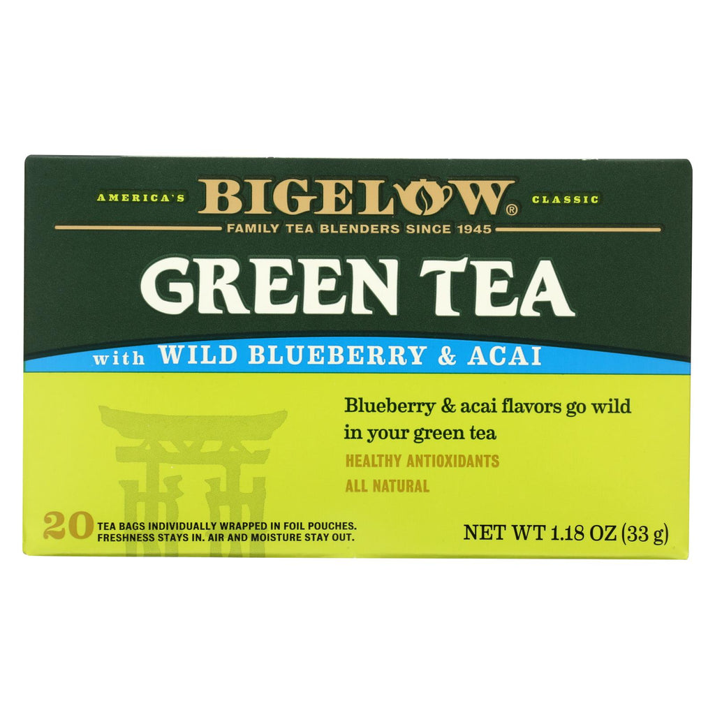 Bigelow wild blueberry & acai green tea takes on a sweet, tart twist with fruity hints accenting classic green tea leaves. Packed in special foil pouches, these tea bags stay fresh and flavorful while making it easy to brew a hot cup. The box, bags, strings and tags in this 20 count package are 100% biodegradable to support your green efforts, and you get a healthy dose of antioxidants in this all-natural drink.