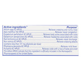 ingredients : active ** allium cepa 3c hpus purpose* relieves sneezing and runny nose apis mellifica 15c hpus purpose* relieves nasal congestion eupatorium perfoliatum 3c hpus purpose* relieves body aches associated with colds gelsemium sempervirens 6c hpus purpose* relieves headaches associated with colds kali bichromicum 6c hpus purpose* relieves nasal discharge nux vomica 3c hpus;contains less than 10-5 mg alkaloïds per dose;purpose* relieves sneezing attacks phytolacca decandra 6c hpus purpose* relieves m