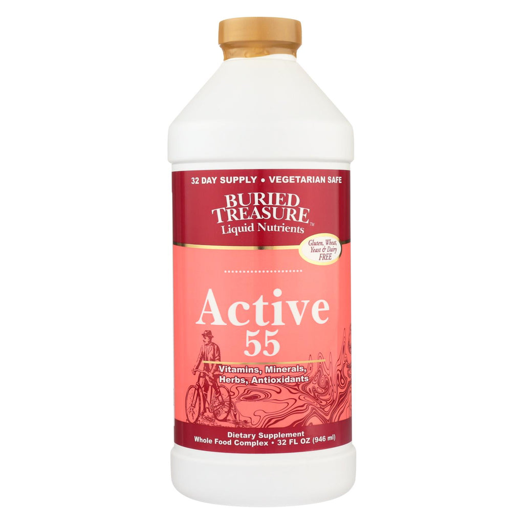 Buried treasure liquid nutrients, active 55 is a dietary supplement that supports active seniors. As we advance through life, our bodies change and nutritional requirements change as well. Give your body the nutritional boost it craves and defy your age. This vegetarian dietary supplement is wheat, gluten, yeast and dairy free. Each bottle of buried treasure liquid nutrients, active 55 contains 32 fl. Oz. Of product. See nutrition facts panel for warnings.