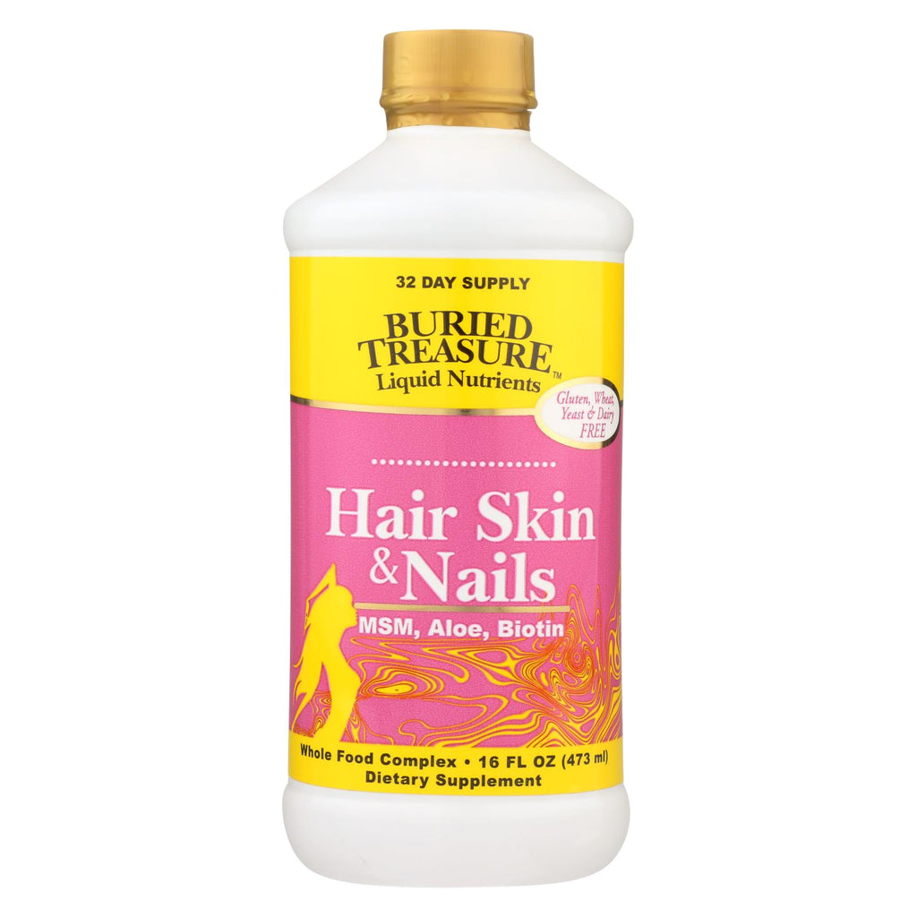Buried treasure liquid nutrients, hair, skin & nails is a dietary supplement that promotes glowing skin, shiny hair and strong nails. Optimal health of skin, hair and nails is dependent upon adequate daily intake of key nutrients that supply the assurance of radiant health. This dietary supplement is wheat, gluten, yeast and dairy free. Each bottle of buried treasure liquid nutrients, hair, skin & nails contains 16 fl. Oz. Of product. See nutrition facts panel for warnings.