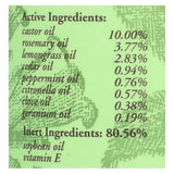 ingredients : active : castor oil 10.00% rosemary oil 3.77% lemongrass oil 2.83% cedar oil 0.94% peppermint oil 0.76% citronella oil 0.57% clove oil 0.38% geranium oil 0.19% inert : 80.56% soybean oil vitamin e