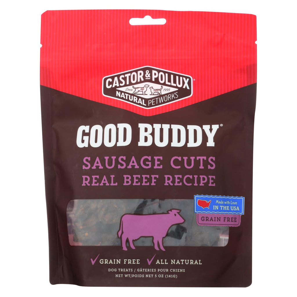 Castor & pollux dog treats good buddy sausage cuts, real beef recipe is a healthy and delicious treat for your canine companions. Made with natural ingredients, castor & pollux dog treats good buddy sausage cuts are free of unnatural and unnecessary additives. This product is all natural and does not contain wheat. Each bag of castor & pollux dog treats, good buddy sausage cuts, real beef recipe weighs 5 oz. See label for warnings.
