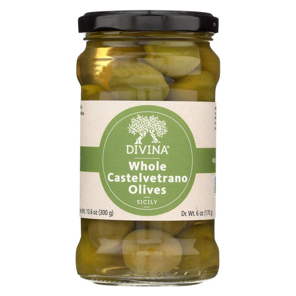 Divina castelvetrano olives are a delicate snack or delicious addition to a variety of meals. These whole olives are prepared in a brine free from harmful or unnecessary additives, preserving the pure, natural taste of the olive itself. The sharp taste of these green olives can complement a variety of dishes or they can stand on their own. Each jar of divina castelvetrano olives contains approximately 12 servings and 35 calories per serving. Additionally, with 30 calories from fat in each serving, divina castelvetrano olives can contribute to a healthy fat intake, as part of a balanced diet. See nutrition facts panel for allergens. Includes one 10.2 oz. Jar of divina castelvetrano olives.