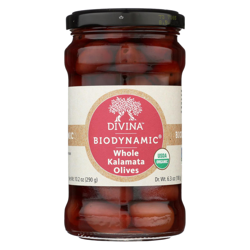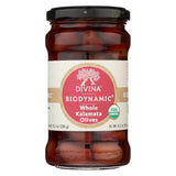 Divina, olives, biodynamic whole kalamata are organic and non-gmo. This product comes to you in a convenient, easy-to-open glass jar. Each three olive serving contains 45 calories and 7% of recommended daily value of fat. Divina, olives, biodynamic whole kalamata are a great addition to any meal, snack or vegetable tray. Every jar of divina, olives, biodynamic whole kalamata contains 10.2 oz. Of product. This product is manufactured in a facility that also processes milk. Please see nutritional facts panel for information concerning possible allergens or warnings associated with this product.