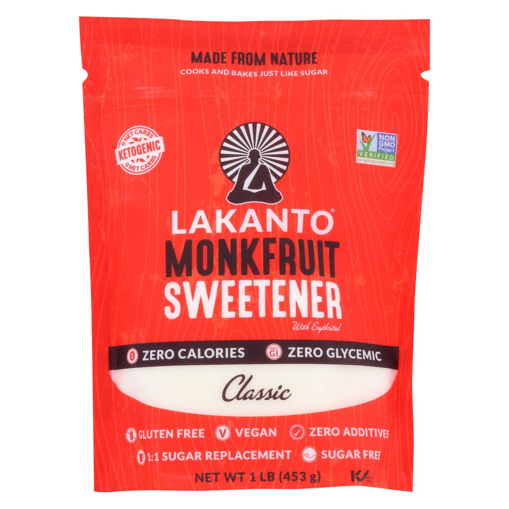 Lakanto monk fruit sweetener sweetens your recipes just like sugar, but contains no calories or fat. This zero-glycemic sweetener uses high-purity monk fruit extract and non-gmo erythritol, a natural sugar alcohol from certain fruits and vegetables, making it a vegan alternative. With just as much sweetness as sugar, this healthier sweetener works on a one-to-one replacement basis for cooking, baking and other uses for easy swapping. Each 1 lb. Bag contains enough sweetener for 311 servings.