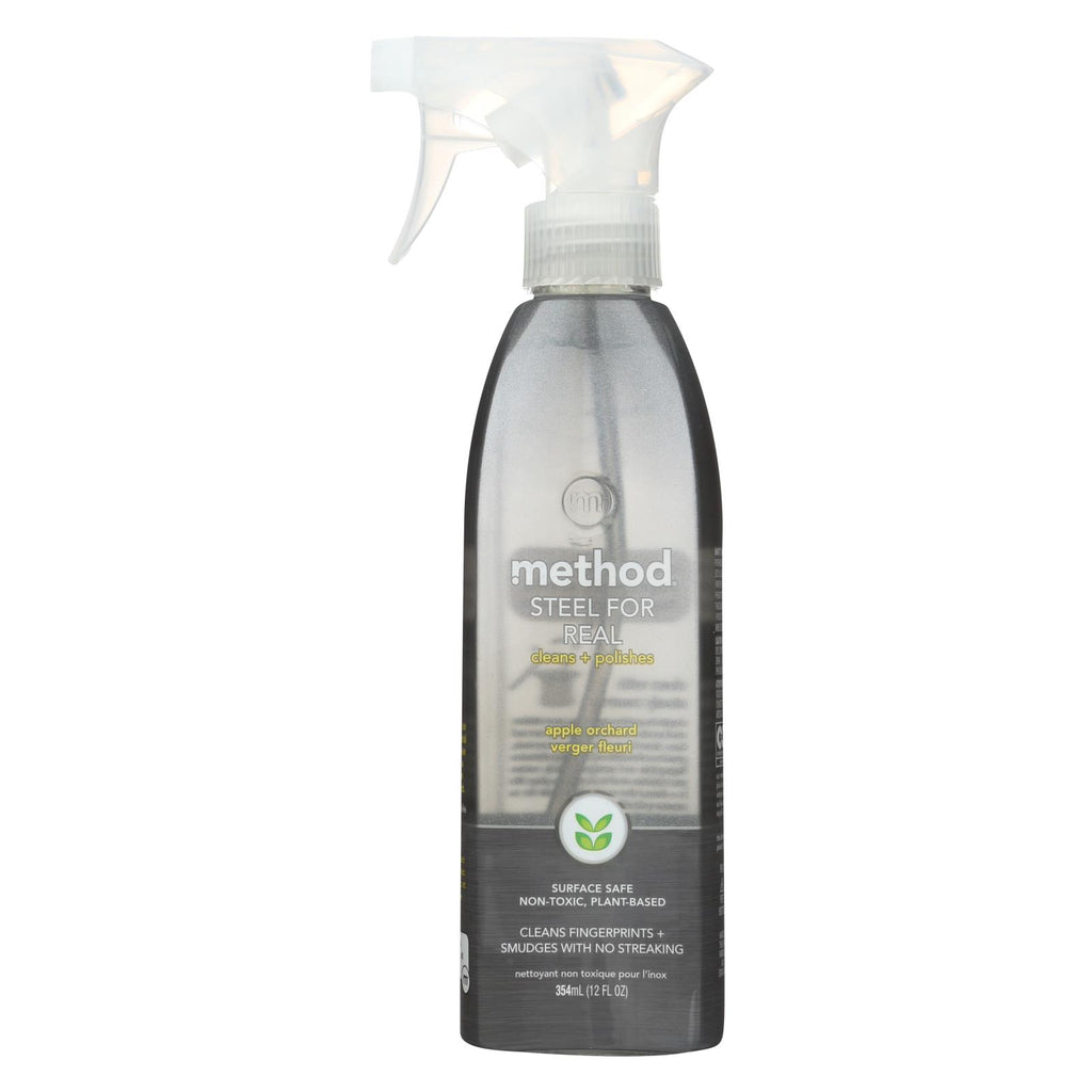 Method apple orchard steel for real is specially formulated with plant-derived ingredients to clean and polish fingerprints and smudges on steel without leaving streaks. One 354 ml. Bottle of method is non-toxic and produced without animal testing, for an uncompromising clean without added chemicals.