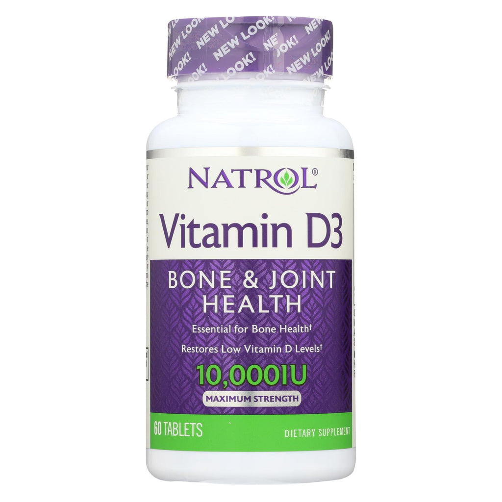 Natrol vitamin d3 bone & joint health dietary supplement provides a full 10,000 iu of vitamin d3 in every softgel to help quickly restore low vitamin d3 levels. Vitamin d3 is essential for bone health, and we make this vitamin d3 supplement without artificial colors or flavors. This bottle holds 60 softgels of maximum strength vitamin d3 supplement with added boron.