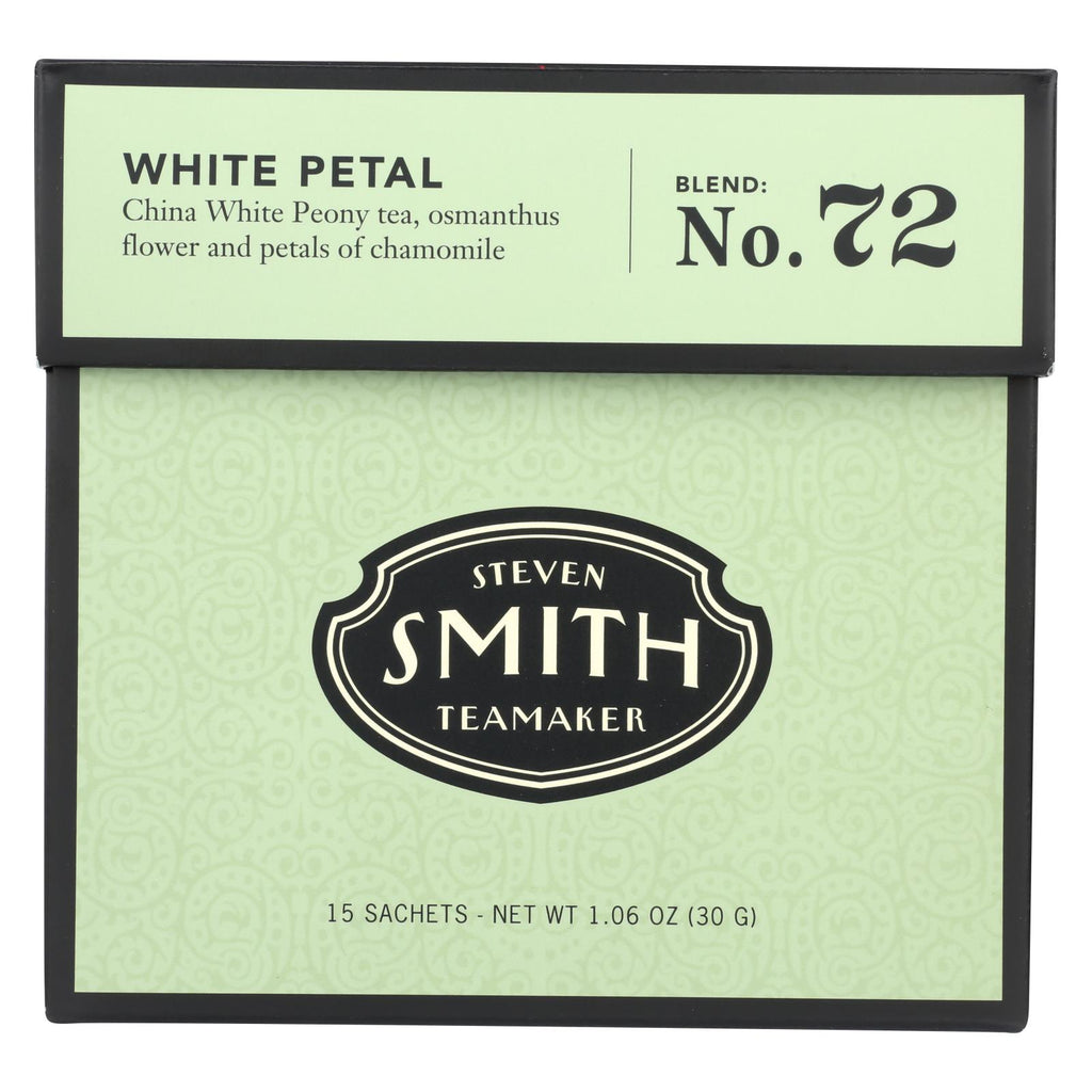 Steven smith teamaker white petal full leaf white tea is a harmonious blend of white petals from handsorted chamomile flowers, china white peony tea and osmanthus. We've purposely left room inside each sachet to allow greater leaf expansion for a great taste. Its subtle and refined flavor is compliments of these shade-dried leaves, grown in china's fujian province. This box contains 15 white tea sachets.