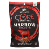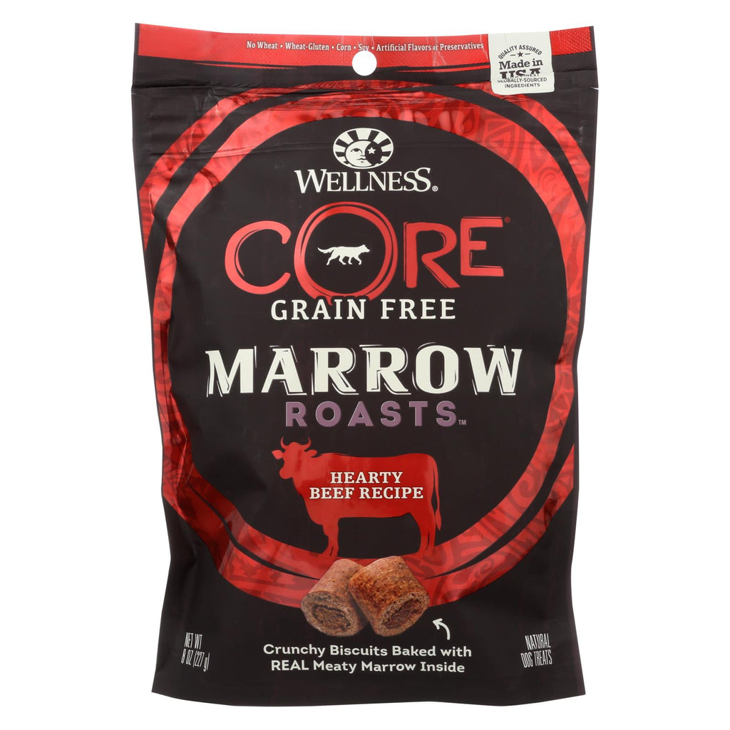 Wellness core marrow roasts hearty beef recipe dog treats speak to the primal ancestry of man's best friend with bite-size morsels of authentic beef bone marrow. Our delicious biscuits are also flavored with wholesome ingredients such as flax seed, sweet potatoes and rosemary while providing a crunchy texture that dogs love. This bag contains 8 oz. Of tasty treats that are gluten-free.