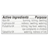 ingredients : active apis 6x purpose burning;itching;swelling euphrasia 6x purpose redness;swelling;watering pulsatilla 6x purpose itching;hay fever;watering;eye complaints in children sabadilla 6x purpose watering;redness of lids inactive borate buffer;purified water;silver sulphate;as preservative;sodium nitrate