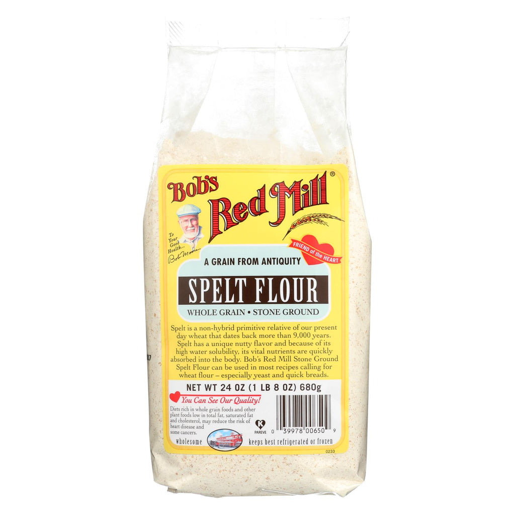 Bob's red mill flour, stone ground spelt, 24 oz. Bag bob's red mill flour is a kosher, heart healthy, whole grain spelt flour you will love baking with. A grain from antiquity, spelt is a tasty and simple way to add nutrition to your baking. Spelt has a unique nutty flavor and because of its high water solubility, its vital nutrients are quickly absorbed into the body. Spelt flour can be used in most recipes calling for wheat flour, especially yeast and quick breads. This is a wholesome, delicious, carefully created bag of healthy goodness. Every bag contains 24 oz. Or 680 g. Of flour. See nutrition facts panel for allergens. A wonderful way to make your baking healthier.