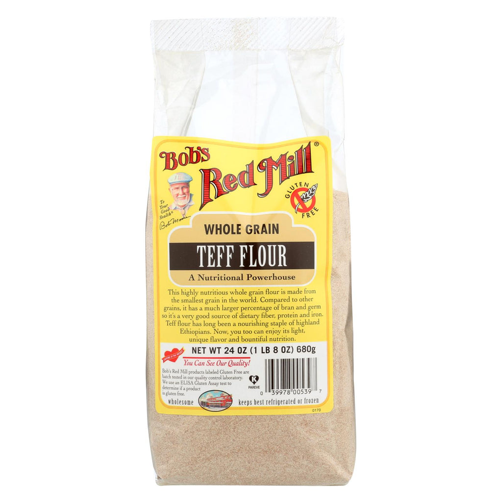 Bob's red mill flour, teff whole grain is a kosher, heart healthy, whole grain flour you will love baking with. A nutritional powerhouse and friend of the heart, you can substitute up to one quarter cup teff flour per cup of wheat flour in your favorite baked goods recipes for added nutrition and teff's unique and wholesome flavor. Teff is a tasty and simple way to add nutrition to your baking. Teff is made from the smallest grain in the world. Compared to other grains, it has a much larger percentage of bran and germ, so it's a very good source of dietary fiber, protein and iron. Teff is an ancient grain that has made a comeback. Enjoy its unique flavor and bountiful nutrition. Every bag contains 24 oz. Or 680 g. Of flour. See nutrition facts panel for allergens. A wonderful way to make your baking healthier.