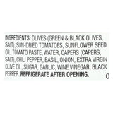 ingredients : olives;green & black olives;salt;sun-dried tomatoes;sunflower seed oil;tomato paste;water;capers;chili pepper;basil;onion;extra virgin olive oil;sugar;garlic;wine vinegar;black pepper