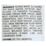 ingredients : filtered water;gluten-free soy sauce;water;soybeans;salt;alcohol;to preserve freshness;balsamic vinegar;wine vinegar;grape must;contains sulfites;apple juice concentrate;evaporated cane sugar;apple cider vinegar;chipotle chile;onion;xanthan gum;black pepper;cumin;tomato paste;fish sauce;anchovies extract [incl. Water];sugar;molasses;garlic;tamarind concentrate;ginger;lime juice concentrate;thyme