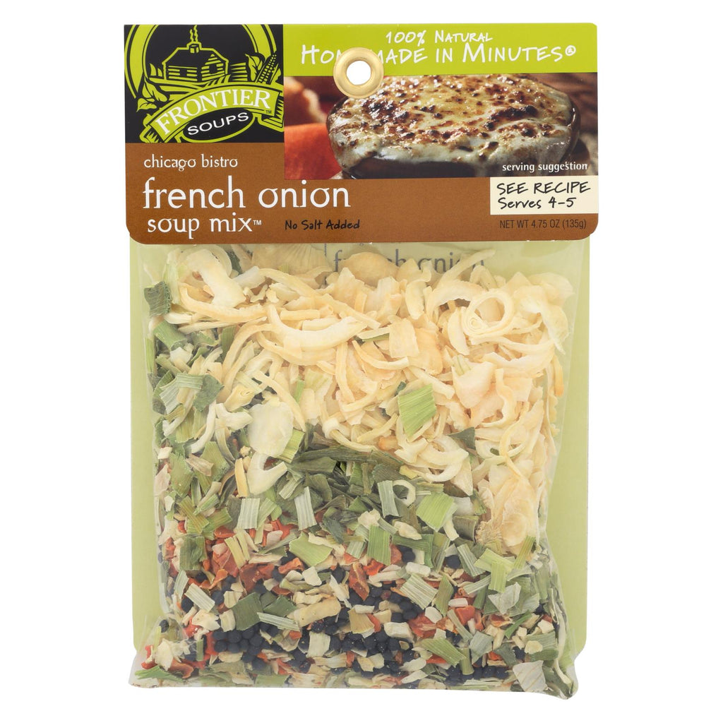 Frontier soups french onion soup mix is an easy to make homemade soup ready in under 50 minutes and made with 100% natural ingredients including black beluga lentils, onions and carrots. One 4.75 oz. Package of french onion soup mix is produced with no added preservatives, salt or msg for a healthy soup so delicious everyone will think you made it from scratch.