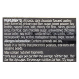 ingredients : almonds;dark chocolate flavored coating;palm kernel oil;chicory root fiber;sugar;cocoa powder;soy lecithin;natural flavor;salt;honey;glucose syrup;rice flour;dark chocolate;unsweetened chocolate;cocoa butter;vanilla extract;cocoa nibs;coffee;madagascar vanilla;sea salt