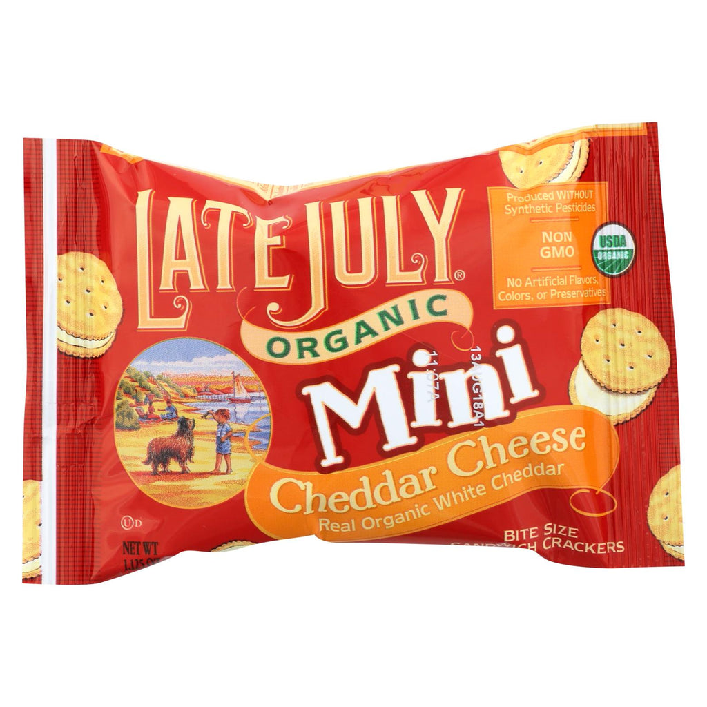 Late july organic mini cheddar cheese bite size sandwich crackers contain real organic white cheddar cheese in every bite for an authentic taste to give your kids as a snack for school lunches or for when you need a pick-me-up at work to hold you over until dinner. Our recipe takes creamy a cheddar cheese blend and then we spread it between two round crackers for a buttery, crunchy and savory snack. Each 1.125 oz. Bag delivers 150 calories in a single serving.