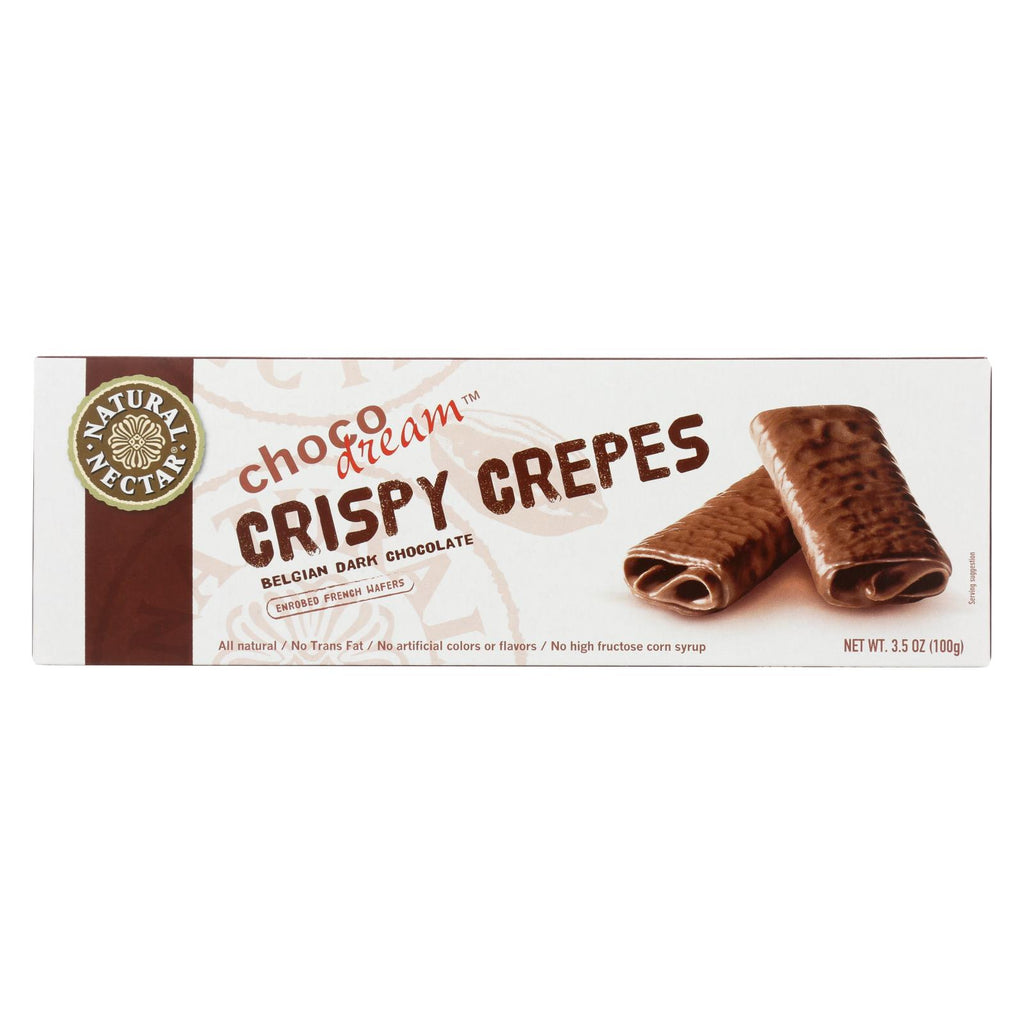 Natural nectar belgium dark chocolate crispy crepes are a delicious treat that do not contain artificial colors and flavors. This 3.5 oz. Box of crepes has 6 pieces per serving, contains no trans fat and no high fructose corn syrup, and it is made with natural, 43% dark chocolate. See nutrition facts panel for allergens.