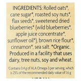 ingredients : whole grain rolled oats;cane sugar;roasted soy nuts;flax seeds;sweetened dried blueberries;wild blueberries;apple juice concentrate;sunflower oil;cinnamon;sea salt