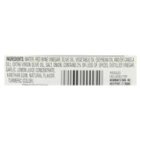 ingredients : water;red wine vinegar;olive oil;vegetable oil;soybean oil and/or canola oil;extra virgin olive oil;salt;onion;contains 2% or less of: spices;distilled vinegar;garlic;lemon juice concentrate;xanthan gum;natural flavor;turmeric;color