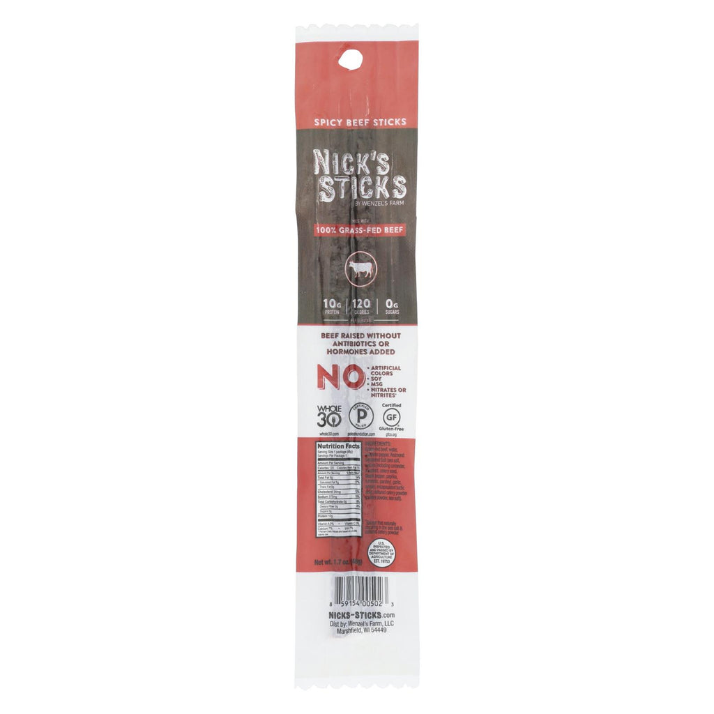 Nick's sticks, spicy grass-fed beef are 100% gluten-free beef sticks spiced with jalapeno pepper. These wholesome snacks are a great source of protein and are free of msg and nitrates, except for the nitrates that occur naturally in celery juice and sea salt. This product is ideal for low-carb or gluten-free diets. Each stick comes in a 1.7 oz. Package.