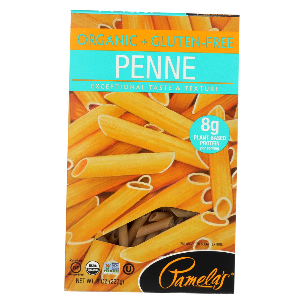 Pamela's products penne pasta is made from organic white rice flour and pea protein for a firm texture and chew. Cook in boiling water and serve with your favorite pasta sauce, or top with cheese or butter and eat alone. Each 8 oz. Box contains approximately four servings, and each serving size has 200 calories and 8 g. Of total protein.