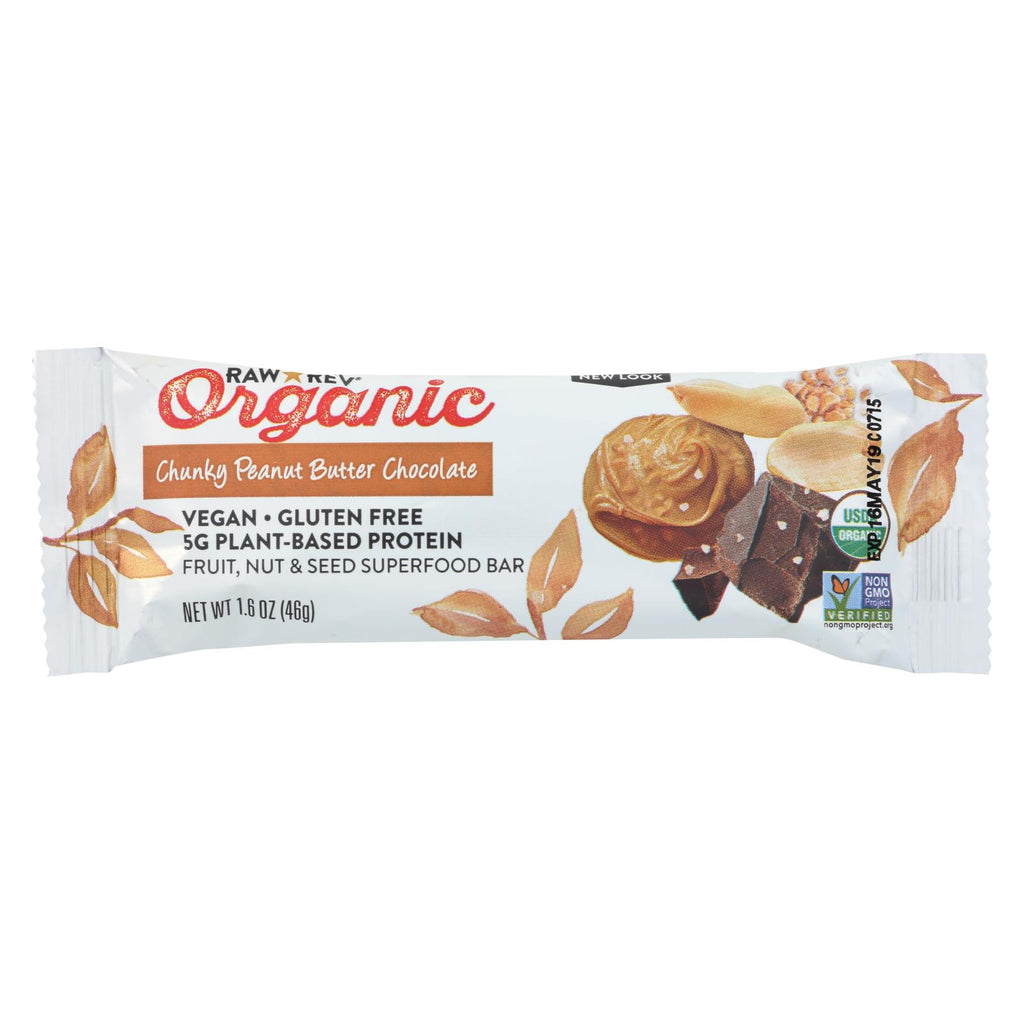Raw rev organic chunky peanut butter chocolate bar contains 5 g. Of plant-based protein in each delicious vegan bar. Made from a wholesome mixture of fruits, nuts and seeds, this bar is studded with chocolate chips for a delightful chewy and crunchy texture. Chomp one of these bars for an energizing boost between meals or when out and about. This package contains one 1.6 oz. Bar.