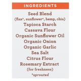 ingredients : seed blend;flax;sunflower;hemp;chia;tapioca starch cassava flour organic sunflower oil organic onion organic garlic sea salt citrus flour rosemary extract;for freshness