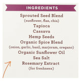 ingredients : sprouted seed blend;sunflower;flax;chia;tapioca;cassava;hemp seeds;organic spice blend;onion;garlic;basil;marjoram;oregano;organic sunflower oil;sea salt;rosemary extract;for freshness