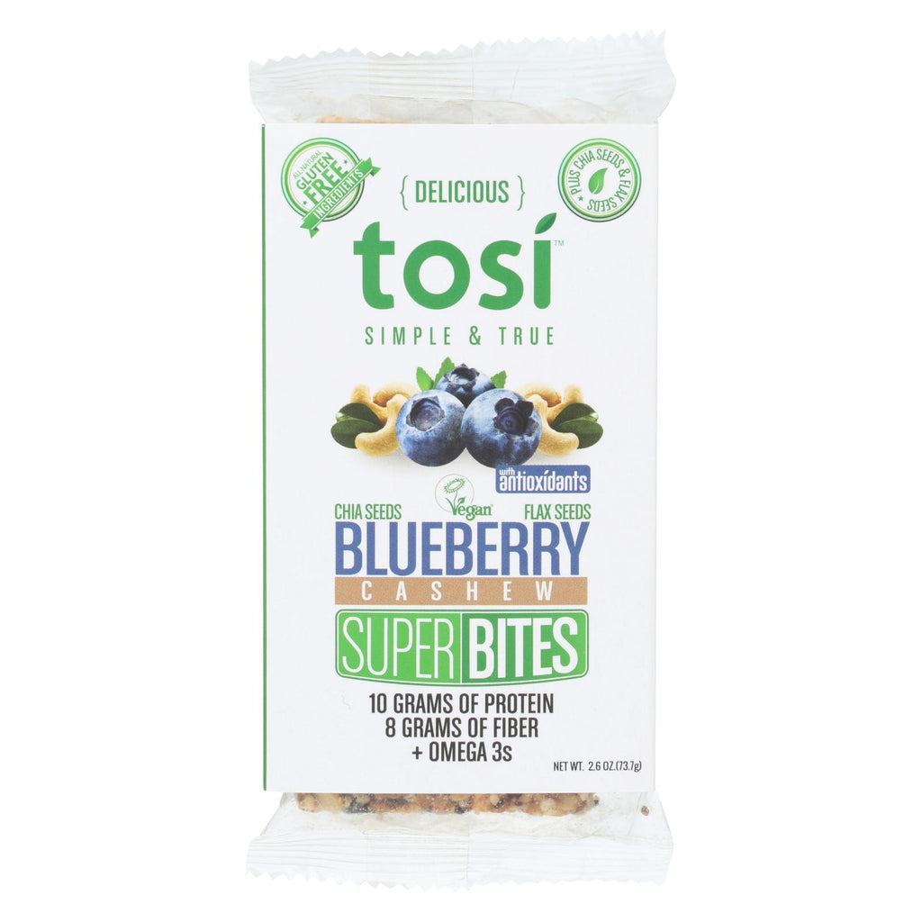 Tosi's blueberry cashew superbites are made with all-natural ingredients. Each 2.6 oz. Bag contains two full servings of our vegan, gluten-free superfood bites. Each serving contains 5 g. Of protein, 4 g. Of fiber and omega-3s. Our delicious recipe includes blueberries, flaxseed, sesame seeds and chia seeds.