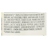 ingredients : : triple filtered purified water;white vinegar;salt vegetable fiber;xanthan gum;cellulose gel;anchovy paste;food color;parmesan cheese favor;nondairy;romano cheese flavor;non dairy;lactic acid;black pepper;garlic flavor;potassium sorbate;sodium benzoate;to preserve freshness;lemon juice;onion powder;sucralose
