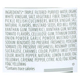 ingredients : triple filtered purified water;organic white vinegar;salt;vegetable fiber;tomato paste;pickle relish;cucumbers;water;vinegar;natural flavors;mustard seeds;red bell pepper;xanthan gum;turmeric;natural tomato flavors;cellulose gum;titanium dioxide;onion powder;garlic powder;mustard flour;sodium benzoate;to preserve freshness;potassium sorbate;rosemary extract;sucralose;caramel color;purple sweet potato color;white pepper;natural lemon flavor;fd&c yellow#5;cayenne pepper;citric acid;fd&c re