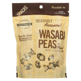 Woodstock wasabi peas, natural are an on the go snack in a 7.5 oz. Resealable bag. Our delicious peas are seasoned with spicy wasabi and pack a savory punch with just the right amount of heat. This product is vegan and features 3 g. Of protein and 3 g. Of dietary fiber per serving. See nutrition panel for allergen information.