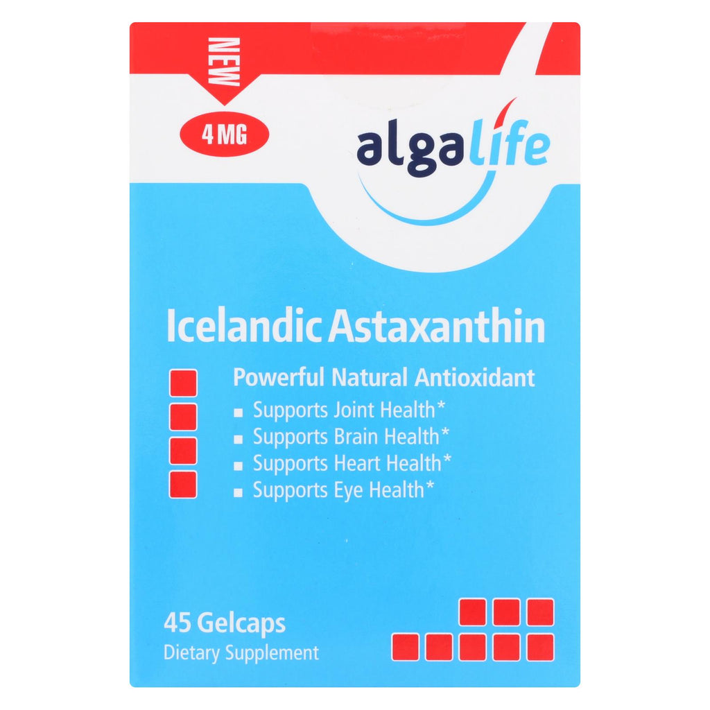 Algalife icelandic astaxanthin 4 mg is a powerful, natural antioxidant. Icelandic astaxanthin is uniquely cultivated in the pristine glaciers of iceland, away from contamination risk. These optimal conditions create pure, clean, premium quality astaxanthin. These antioxidant capsules contain no gluten, no soy, no bovine or porcine, no pesticides or herbicides and they are non-gmo. Astaxanthin has been clinically studied for safety and health. While loaded with benefits, this product is not intended to diagnose, treat, cure or prevent any disease. Each box of algalife icelandic astaxanthin 4 mg contains 45 gelcaps. See nutrition facts panel for allergens.