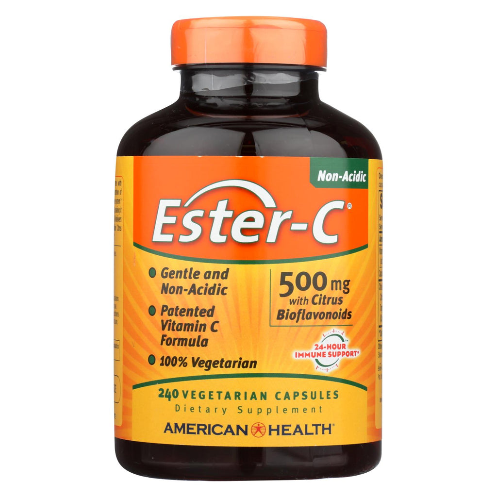 American health ester-c 500 mg. With citrus bioflavonoids is our breakthrough patented vitamin c formula supported with naturally occurring metabolites. Metabolites help enhance the absorption of vitamin c by your white blood cells and we use a unique, chemical-free manufacturing process that neutralizes ph which makes it non-acidic. Our gluten-free dietary supplement has a formula with no gmos and free of artificial flavors, colors and preservatives. There is no soy, sodium, lactose, milk and milk products and no sugar. Included is one bottle of 240 american health ester-c 500 mg. With citrus bioflavonoids vegetarian capsules. See nutrition facts panel for allergens. Good health does not need to be complicated. We understand the complex needs of a healthy lifestyle and develop supplements which work synergistically with your natural physiology to help promote proper balance and wellness.