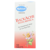 Hyland's backache with arnica contains arnica montana, a flowering plant known for its pain-relieving properties. This product provides temporary relief for stress-related lower back pain. Place two to three tablets under the tongue every 4 hours or as needed. Recommended for adults and children over 12 years of age. This box holds 100 tablets.