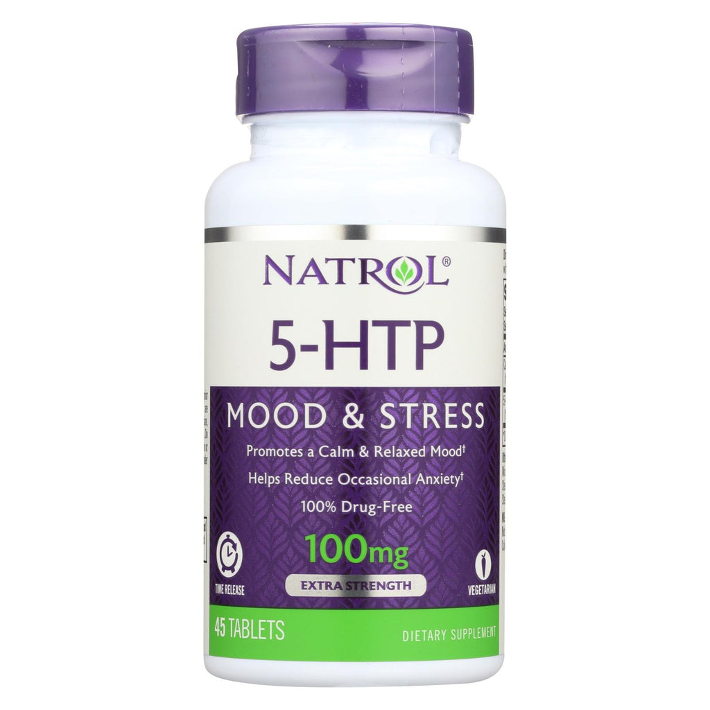 Natrol 5-htp mood & stress 100 mg. Dietary supplement provides calming and relaxing benefits to help you maintain a positive outlook in life. Offering a 100% drug-free and non-habit forming formula, these 45 dietary supplement tablets work by enabling the healthy production of serotonin to help reduce occasional feelings of anxiety. Each tablet in this 45-tablet bottle contains 100 mg. Of plant-sourced 5-htp with controlled two-layer tablet technology for enhanced absorption and assimilation.