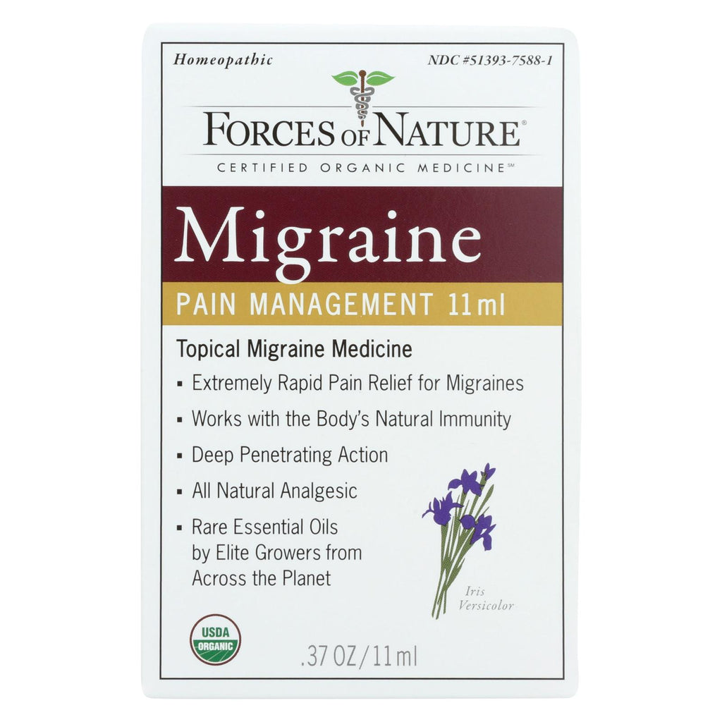 delivers deep penetrating action migraine pain management is 100% pure and all natural. So much so that has been issued the coveted organic certification by the usda. This verifies that all ingredients and medicines in the product are pesticide free and certified organic. This is a proprietary formula developed by forces of nature's naturopathic doctor and company biologist specializing in plant medicine. This remedy is very powerful and has relieved acute migraines with great success. Migraine pain management is an over the counter medication to be applied to the temples and back of the neck. This topical delivery system is designed to provide immediate relief to the area of pain. Medication taken orally takes time to process through the digestive tract. This process is bypassed with application of migraine pain management. It is a registered migraine medication with guaranteed results. Migraine pain management features our unique dual modality approach to healing. It combines certified organic homeopathic medicines which activate immune parameters to help balance the system with certified organic essential oils which are soothing and nourishing. This dual modality approach expands and supports the action of the homeopathic medicine, thereby delivering 2 actions in one and providing fast effective relief. Homeopathic remedies have proven to be highly successful in the treatment of migraines as they can reduce both the pain and the sickness, especially if used in the early stages. Not only can homeopathic remedies be used at the time of a migraine, but they can also help reduce the likelihood of future recurrences. The university of maryland medical center reports that homeopathy may be used when the pain can be described as "hammers beating the head". Hence, anyone suffering from migraines should consider a homeopathic remedy to provide relief and a possible lifetime cure. It is not uncommon for initial improvement to be seen within the first few applications, with an easing of the frequency and intensity of attacks. The maximum and the most permanent results vary per individual but are usually experienced within weeks.