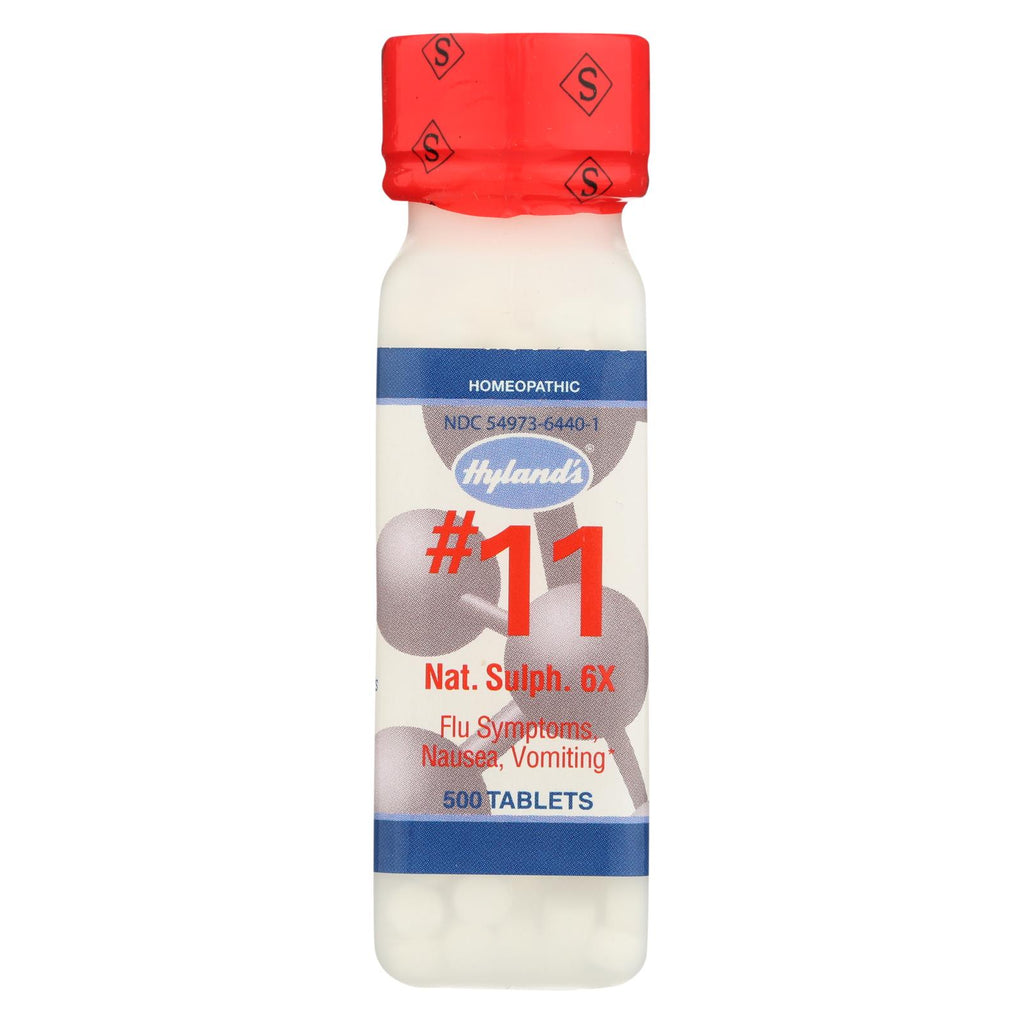 Hyland's no.11 nat. Sulph. 6x description: flu, nausea, vomiting relief of symptoms of the flu, including rheumatic pains, nausea, vomiting. Disclaimer these statements have not been evaluated by the fda. These products are not intended to diagnose, treat, cure, or prevent any disease.