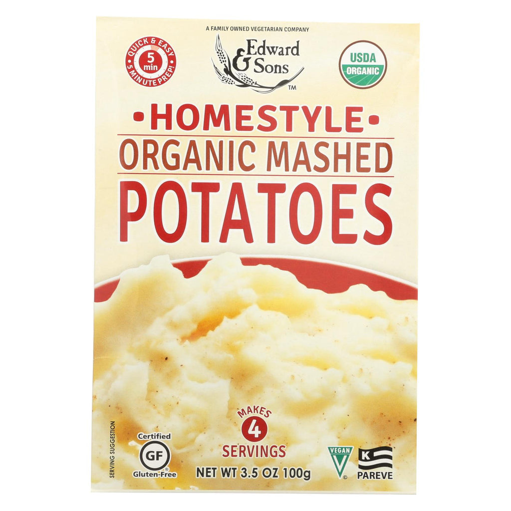 Edward & sons homestyle mashed potatoes are certified usda organic mashed potatoes that can be prepared on the stovetop or in the microwave. Each serving of prepared potatoes contains 120 calories and 0 mg. Of cholesterol. Each 3.5 oz. Box of homestyle mashed potatoes is certified vegan and certified gluten-free.