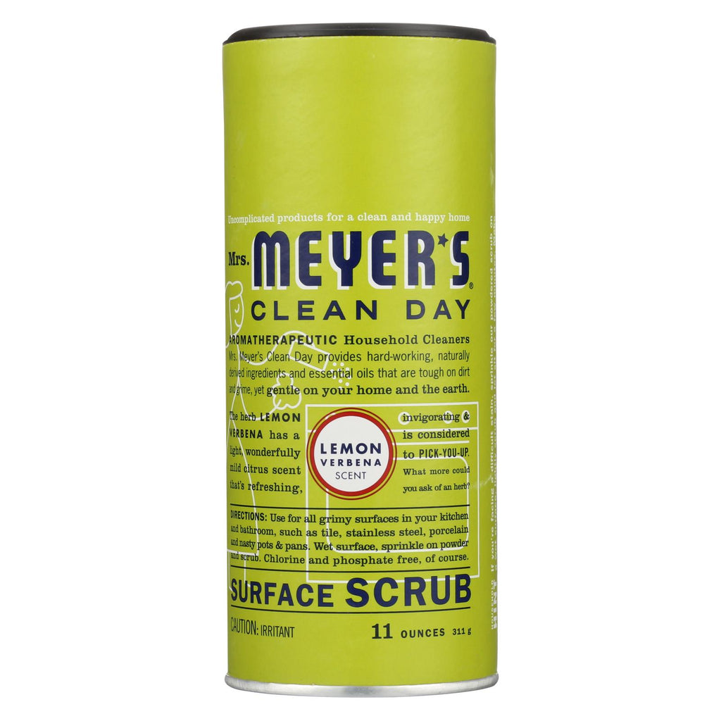 Mrs. Meyer's clean day lemon verbena surface scrub is used for all grimy surfaces in your kitchen and bathroom such as tile, stainless steel and porcelain. Our scrub is made from naturally-derived ingredients, never chlorine or phosphates. Surface scrub comes in one 11 oz. Canister and is certified cruelty-free.