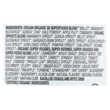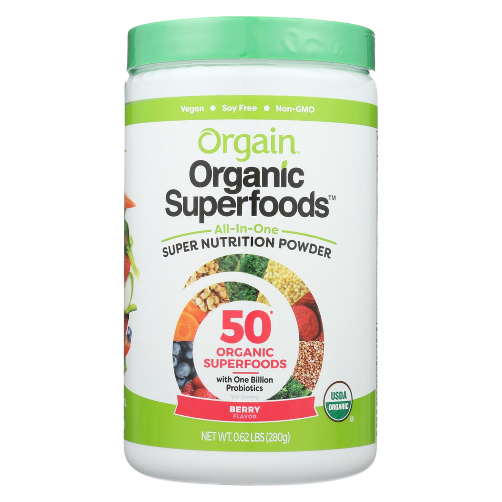 ingredients : orgain organic 50 superfoods blendâ„¢ [millet;amaranth;buckwheat;quinoa;chia;kale powder;apple pulp;cinnamon;organic sprouts blend;amaranth sprout;quinoa sprout;millet sprout;buckwheat sprout;garbanzo bean sprout;lentil sprout;adzuki sprout;flax sprout;sunflower sprout;pumpkin sprout;chia sprout;sesame sprout;organic super veggies;super berries;super grasses and super foods blend;acai;cranberry;wheat grass;barley grass;oat grass;banana;mango;beet;carrot;spinach;broccoli;tomato;kale;cabbage;parsley