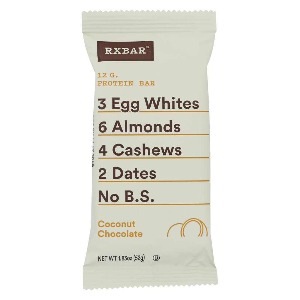 Rxbar protein bar, coconut chocolate provides gluten-free, all natural goodness. There is no added sugar, dairy, peanuts or soy in this healthy bar. There are three egg whites, six almonds, four cashews, two dates, a dash of sea salt and 12 g. Of protein in every bar. Each bar contains 1.83 oz. Of product and 210 calories.
